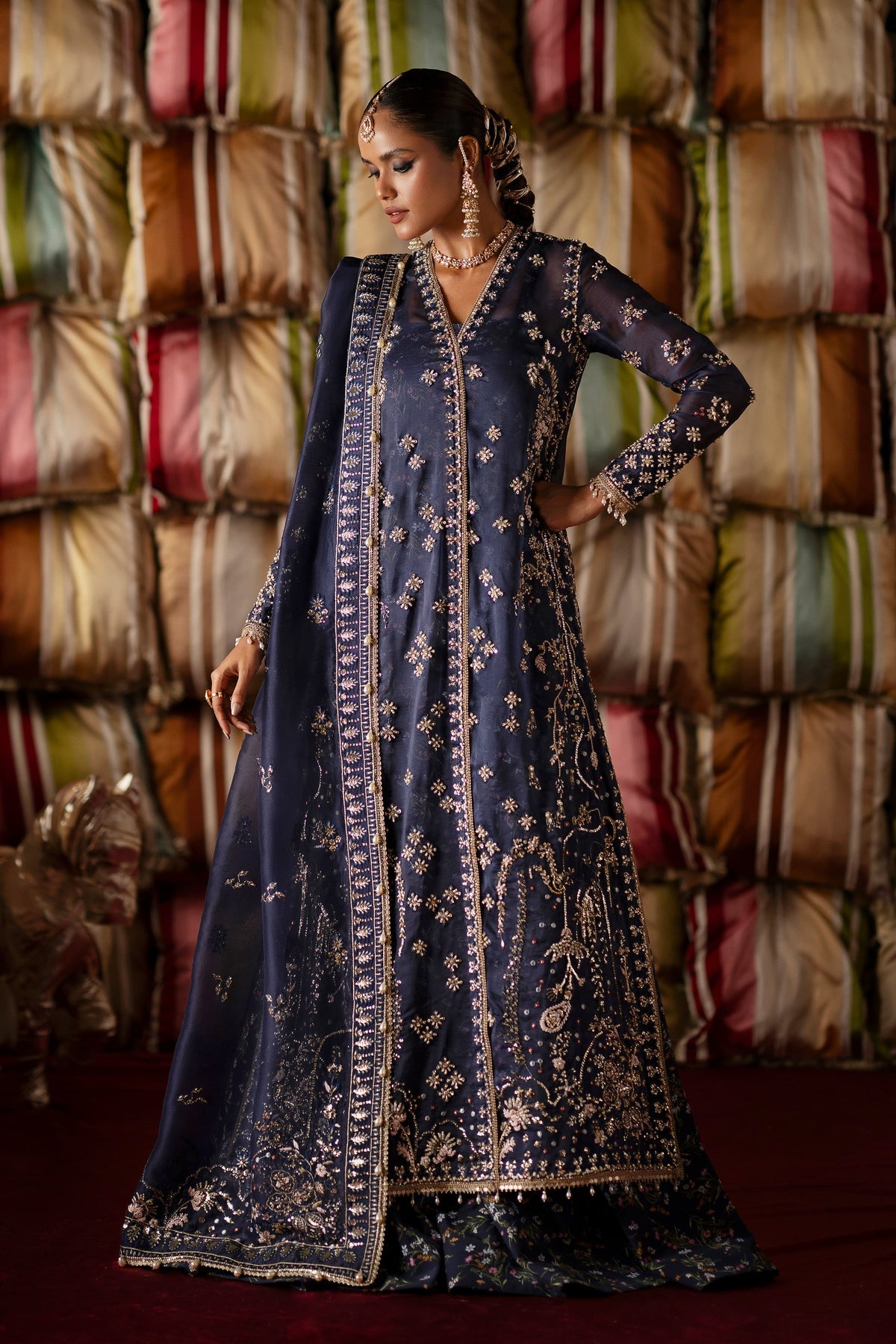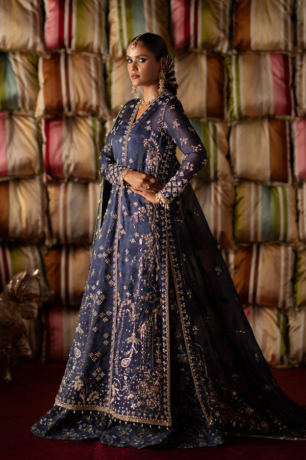 A statement navy blue cross-style long shirt adorned with exquisite embroidery and delicate handwork. Paired with printed sharara pants and an undershirt for a graceful silhouette, this ensemble is elevated with a beautifully embroidered dupatta—perfect for timeless elegance.